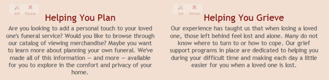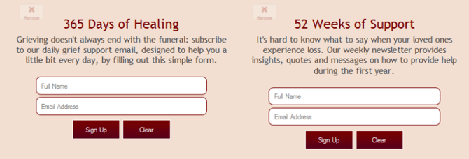 The 365 Days of Healing and 52 Weeks of Support widgets can’t be edited. To remove either one, click on the Remove button. Once removed, there will be no way for you to bring it back. Please contact us if you wish to have this on your website.
