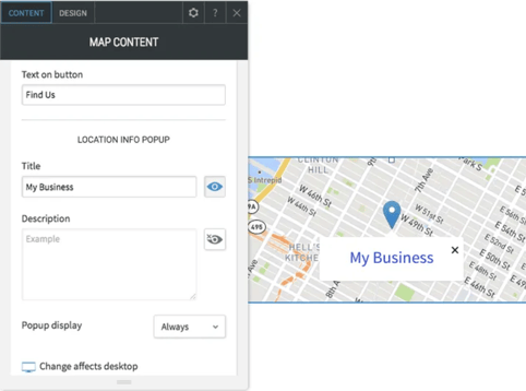 You can also display a location info popup on the map widget. Change the title, description and display options in the Content Editor of the map widget.