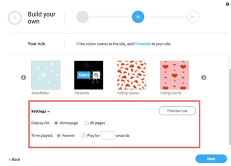 Personalization Rule special effects add animations to your website; for example, floating hearts or falling leaves. Use these special effects to celebrate events or add a touch of color.