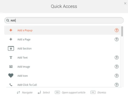 Quick access search allows you to quickly find functions in the website editor.