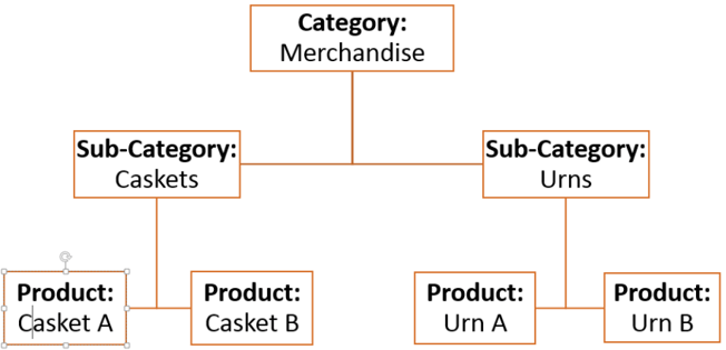 Type in the name of the new category and the corresponding classification (sub category). Ex. To add a specialty casket selection, type in Specialty Casket and under Classification, choose Merchandise: Caskets. Save.