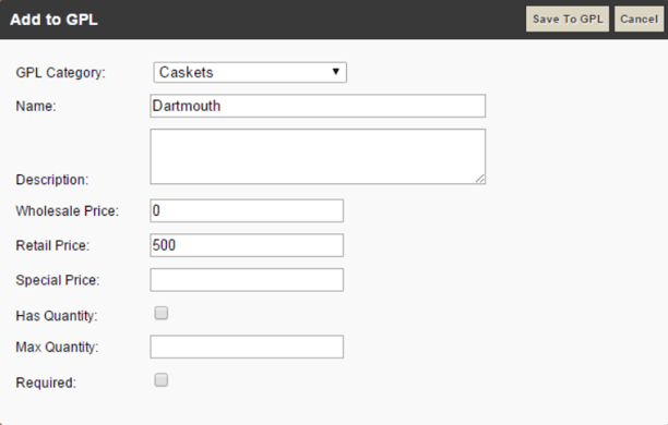 Builder Name : Each GPL in the system should have it’s own unique name to identify it (Ex. ABC Funeral Home Quote Builder)