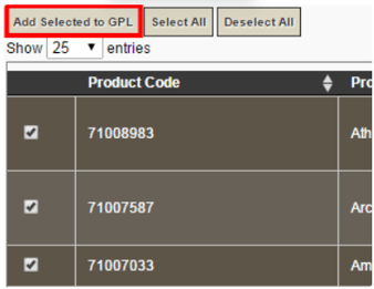 Select the green Add + button to add products to the GPL. This will bring up the product menu.