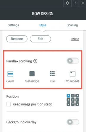 Enable or disable a row’s background image parallax effect. Click the style tab in the Design Editor for the row to find the toggle to enable or disable Parallax Background and Scrolling. To make a parallax row, pan over the top left of a row until a row button appears, click the Row button, click Edit Design. Refer to the Parallax section and toggle the button to enable parallax scrolling.