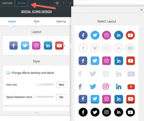 Style - change style features such as the size of the social icons and the spacing between icons.
