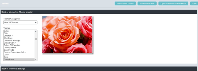 The Pulse system will be set with a default theme for Book of Memories, however, you can personalize the theme for each individual. There will be a list of themes pre-loaded in the system to choose from.