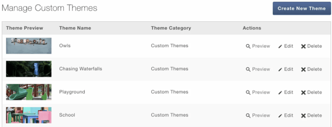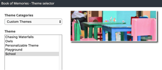The theme selector allows you to select custom theme images or images from our library to use on book of memories pages.