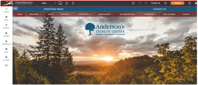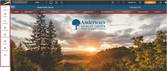 The left menu has features to make broad, sweeping changes to the entire Site. For example, changing the color scheme or button design in the design tab, add new features and widgets with the widgets tab, change your pages’ configuration in the pages tab, and make administrative changes in the settings tab (i.e, changing the site’s URL or adding analytics).
