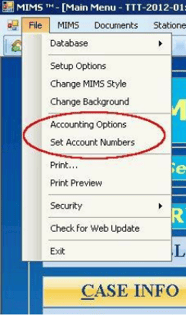Open MiMS and under the File Menu click on Accounting Options. The Accounting Options window will open.