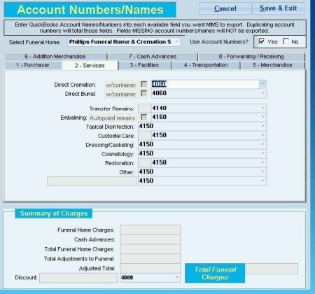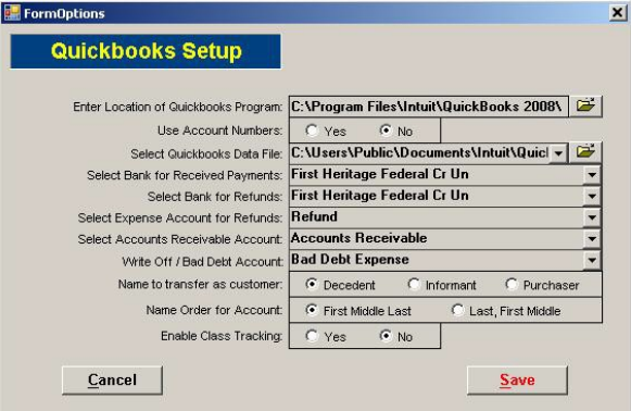 From the Drop-down Menus select the appropriate Account Name/Number for each field. (Entering the same Account Name/Number in multiple fields will total those fields. Fields without Account Names/Numbers will NOT be transferred to Quickbooks).