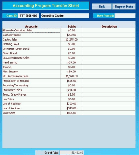 - Verify that the totals appear correct and if so, click on the Export Data button to transfer the displayed information to Quickbooks/Peachtree.