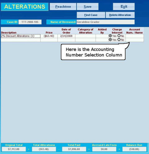 When entering in alterations in MiMS make sure that you fill in the correct account to use for each alteration. If you do not then you will not be able to transfer the alteration to Quickbooks/Peachtree.