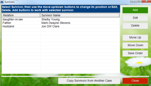 After you select the people you wish to copy click on the “Copy Now” button and the survivors will be copied into the local survivors list. All you need to do is update the information for these survivors if applicable and add in any other survivors you desire and when you are finished close the survivors list window.