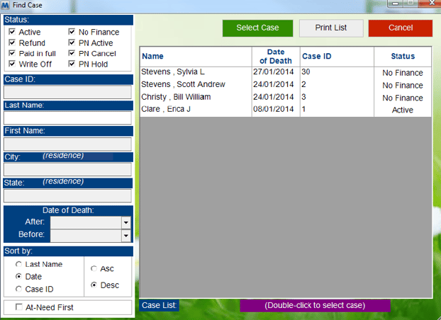 Once you click on the “Copy Survivors from Another Case” button the MiMS “Find Case” window will open.