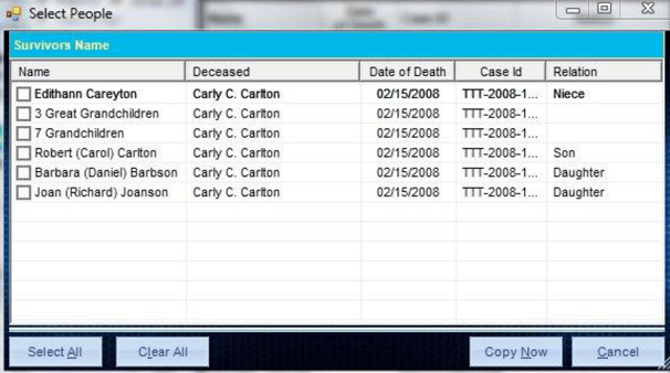 Once you have selected a case to copy survivors from the “Select People” window will open to choose which survivors from that case you wish to copy.