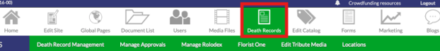 The death records section is where all records added to the system will be listed out with options to add new records, change settings for obituary pages and manage various components of obituary pages.
