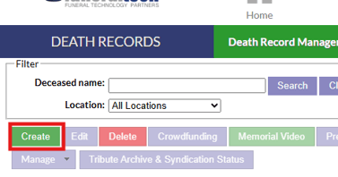 From the Death Record tab, click the create button to begin the creation of a new record. You will be brought to the “Death Record” editing screen.