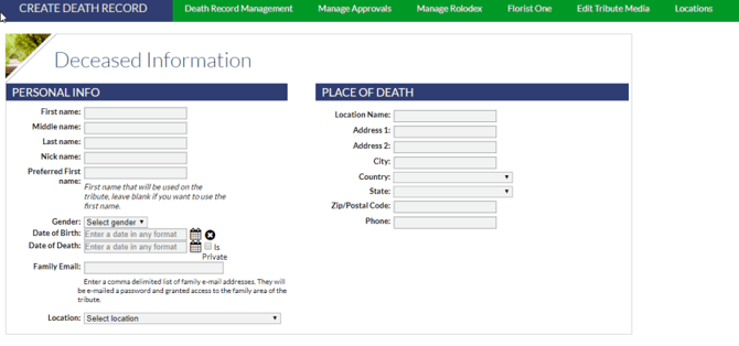 Please note that most fields are not necessary for the creation of a record. The only fields that are mandatory to proceed with Saving a record are: First & Last Name, Gender, and Date of Death.