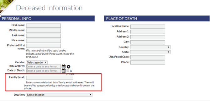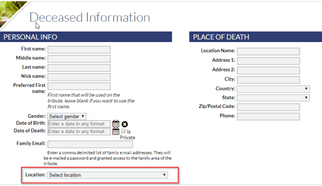 If you have a multi-location funeral home (not necessarily a multi-site) system, you will have the ability to Select a Location. This will appear as an option just below the Family Email section in the Deceased Info box. Clicking on it will allow you to make sure that it is assigned correctly for the benefit of your users. It is important to do so as it will be showcased on the “View All Tributes” section of your website, as well as in thank-you notices for features like Donations.