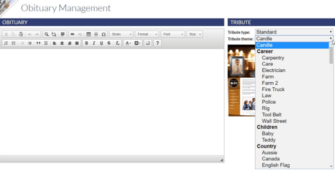 Funeral Tech is pleased to offer a wide variety of Tribute themes to our users. Simply click on the dropdowns to the right of the Obituary section to choose from our selection. Themes can be changed at any time. A preview of the theme will show in the image next to it.
