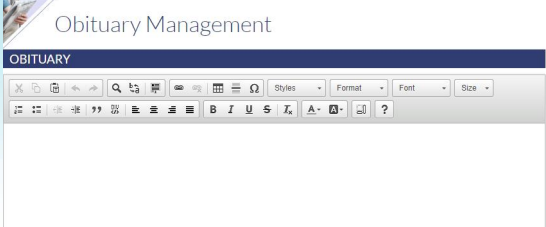 The Obituary section allows for either typing or obituary pasting. Note that most browsers will require the use of CTRL + V or CMD + V to paste the obituary into the field. Text editing options are available in the text editor to format text, change font sizes, align and add links.