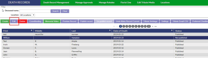If you need to change, add, or remove information that is on an existing record, click on the record from the record list on the death records page, then click the edit button. This will take you into the record editing page.