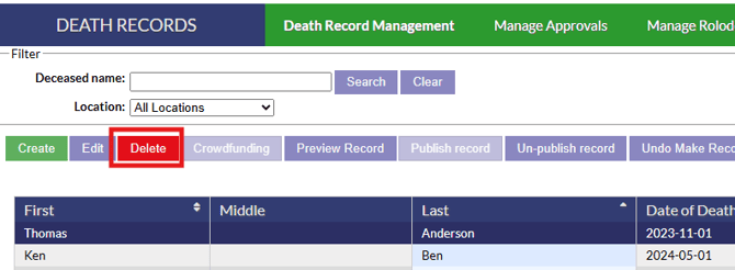 To delete a record, select the record from the record list on the death records page, then simply click the red delete button. Deleted records can be recovered by Funeral Tech support, if you need to recover a deleted record reach out to support at support@funeraltech.com