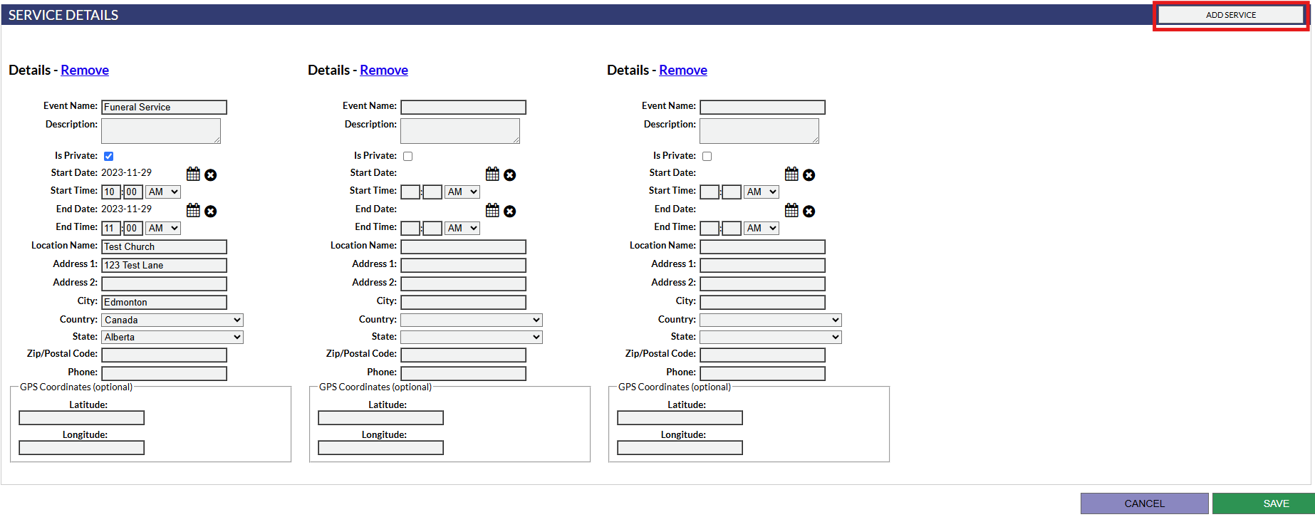 NOTE: If you have a multi-part event (like a visitation from 11-1, then 3-5), these will need to be added as two separate events.