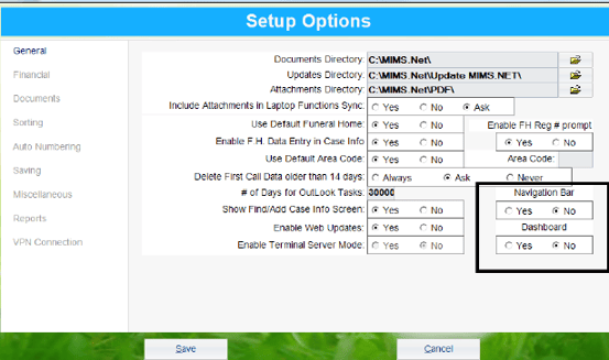 To activate either the Dashboard or the Navigation Pane you must go into the Setup Options and check “Yes” to either the Dashboard or Navigation Pane options on the first tab.