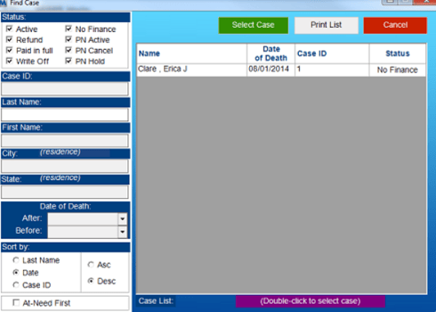 Click on “Find a Case”. A list of all cases will appear in the Find Case window. Type in the last name or any field of information, and the case list will narrow down based on the criteria you select. When the name appears at the top of the list or is highlighted, click Select and you will return to the Vital Statistics window, with the case you have selected on your screen. You may also place your mouse pointer on the desired case and double-click to return to the Vital Statistics window.