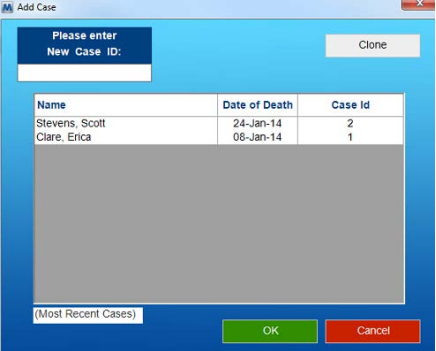 - If you are entering a new case that has some relation to a previous case that has been entered into MiMS, use the “Clone” button located in the Add Case box. Add in the new Case ID number for the case. Once you click on OK the relevant information will be copied into the current case, then all you need to do is add the personal and current service information.