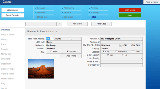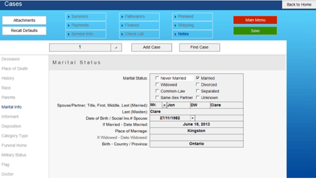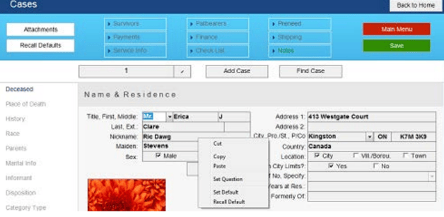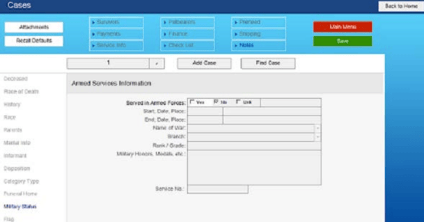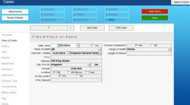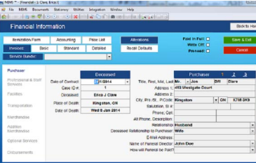 The case information area in MIMS allows for a variety of information to be entered about the deceased along with financial information, payment information and service event information.