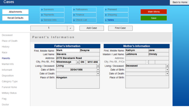 The parents tab lets you enter in information regarding the subject's mother and father.