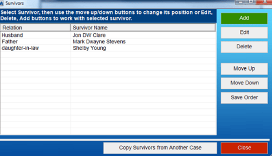 If you have additional Survivors to enter click the Save-Next button and the data will be saved and a new blank form will appear to enter in the next survivor. When you are finished entering in survivors click the Save-Exit button. After clicking Save-Exit you will be taken to the survivor list window which shows a list of all survivors entered at a glance and the order in which they are in. This survivor list window will also be the default window you are taken to any time in the future you go back into the survivor area.