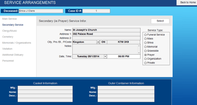 If you have a secondary service, such as a prayer service at your funeral home before going to the church, click on the Secondary Service tab, then follow same steps as the Main Service tab above. For Jewish funeral home systems, you can enter Shiva information here.
