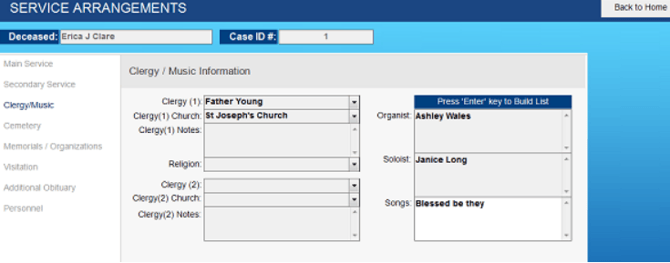 At the Main Service Information section, click Select. A window showing your list of Funeral Homes, Churches and Cemeteries will appear. These and other drop-down lists are based on the information you entered in the initial setup information.