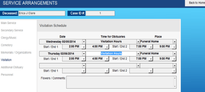 In the Visitation section, you will enter all the visitation dates and times. Double-click your mouse in the date box or use the arrow and a calendar will appear to select the date of the visitation(s). In the Time field, type in the visitation time exactly as you would like it to appear in obituary and death notices. In the Place field choose the location of the Place of the Visitation. Finally, for integration with other software programs like MS Outlook, Google Calendar, FuneralTech website, etc. fill in the Start / End boxes with the specific start and end times of the visitation(s).
