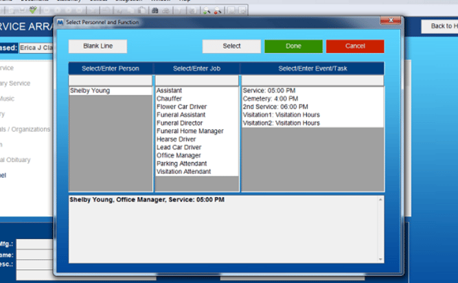 The Personnel tab can be used to schedule personnel for funeral, visitation, service, cemetery or other activities that you have entered in Setup. Click on the Select button. In the first column, you will see the names of your staff; in the second column, a list of jobs from Misc. Lists (such as funeral director, chauffeur, and visitation assistant); and in the third column, any scheduled events (such as service and visitation) for which you have entered a time and date. Just click on the personnel, click the job or function associated with that person, and then click the Select button. Your choices will be added to the Schedule of Personnel. The schedule can later be printed by choosing Documents from the MiMS Taskbar, and clicking on the Basic Service Schedule button.