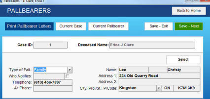 From the CASE INFO window, click “Pallbearers” to add pallbearers. For each pallbearer, enter the name, address and any other pertinent information you wish. Enter information for one pallbearer, and then click Save- Next to enter the next. Click Save-Exit when done. From the information used in this window you can print your choice of several Thank You letters to all of the pallbearers, or any one pallbearer.