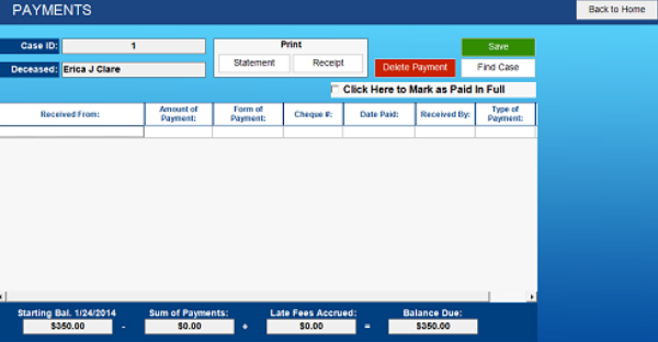 Payments may be entered from either the MAIN MENU or the CASE INFO (Vital Statistics) window.