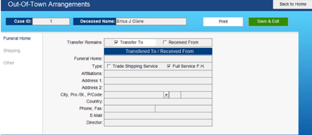 The Shipping area is for noting all shipping related information for bodies that must be transported to or from your funeral home.