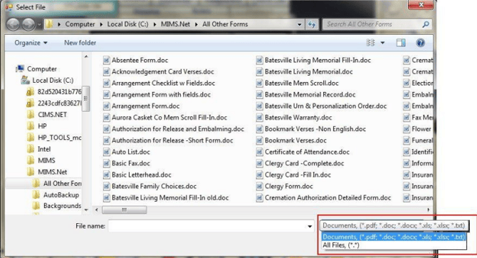 **This window by default only will display .pdf, .doc, .docx, .xls, .xlsx, and .txt. If you are looking to add a file, like an image, that does not match one of the default file types you will need to change the file type from “Documents” to “All Files”.