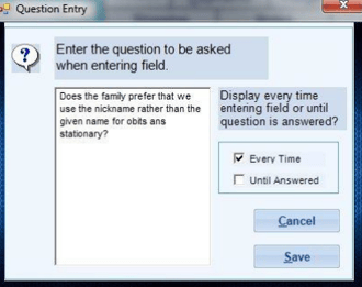 - In the Question Entry pop-up window, type in the question exactly as you would like it to be asked. Make sure you check the appropriate variable box to the right. In this example, we will choose to ask the question every time anyone tabs into or clicks into the Nickname text field. This way, both the question and the answer will be shown every time that field is entered, making it a great way to remind the staff of which name the family prefers is used. (If we chose the option "Until Answered", the question would only be asked until someone typed in an answer, and it would not be displayed again for that case.)