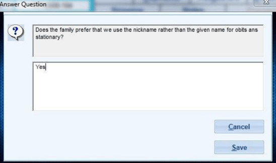 For our example, let's say you want to remind your staff to find out if the family wants the decedent's nickname used, as opposed to their given name.