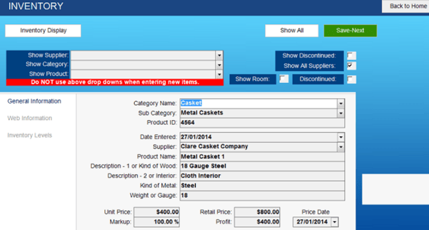 Category Name: Click the drop-down arrow and click the category of product you are entering (e.g., Casket, Vault, Urn, etc), or just start typing and the rest of the words will fill in automatically.