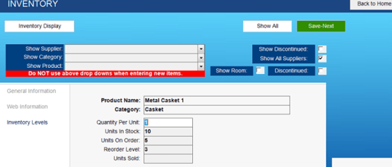 If it is your first time in the Inventory area you will need to make sure the check box for “Show All suppliers” is checked until you are finished entering in all of the inventory items. See Show All Suppliers for more details on the Show All Suppliers button. Any time in the future that you come back into inventory to add in new products you will first want to click the “Save-Next” button before entering in any new items.