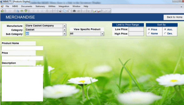 Caskets, Vaults, Urns, Alternative Containers and other inventory are entered in the INVENTORY area of MiMS. The Inventory area of MiMS is located at the MAIN MENU. Once completed, this information will be used to print your Casket, Outer Container and Urn Price Lists and Price Cards. These lists will be used for selecting items on your Statement of Goods and Services. Inventory can be tracked and analyzed in a number of different ways.