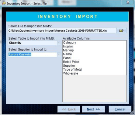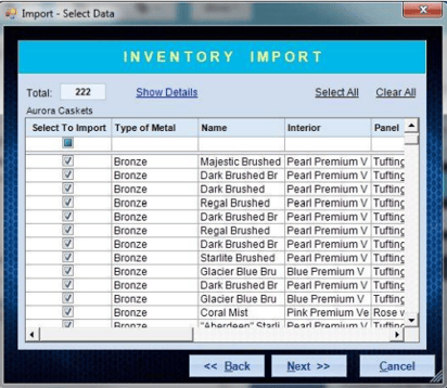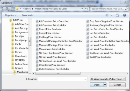 At this point if you wish to load price lists for any other inventory items like urns, or vaults just follow the same steps listed in the above example for loading a casket price list, just changing what document you choose to load.