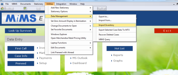 The Inventory Import is a two in one feature. It will both update an existing inventory item and add new inventory items into MiMS. The Inventory Importing feature is located under the Data Management Side menu of the Utilities Menu.