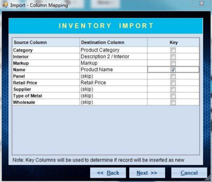 - The next window is the Column Mapping Window. The Column Mapping window is where you decide which areas in the excel file are related to the MiMS inventory and which key item(s) are used for comparing against.